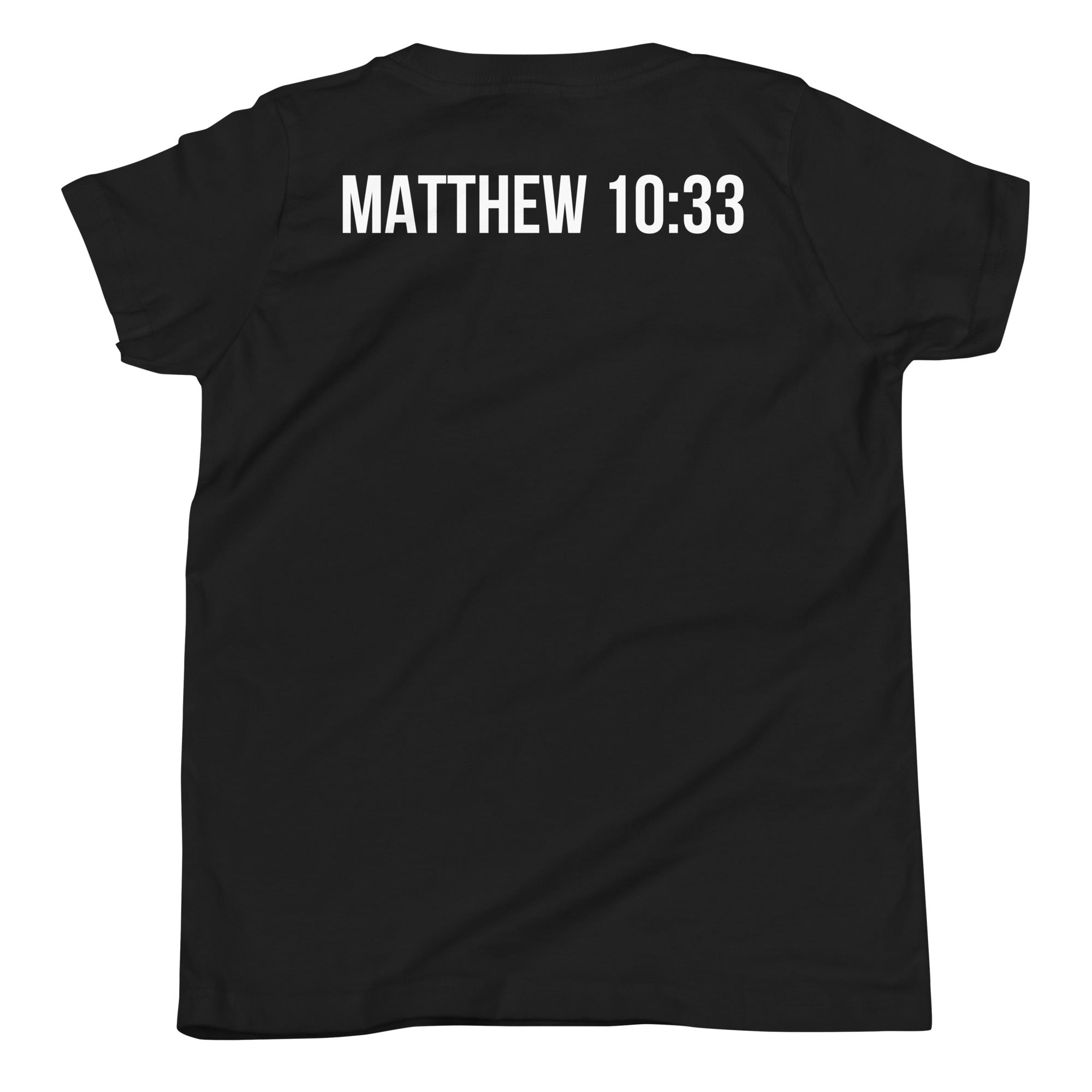 A powerful two-sided design showcasing the bold phrase “Learn Jesus or Learn a Lesson” on the front, highlighted with striking red banners, and paired with the scripture “Matthew 10:33” on the back. This design encourages believers to stand boldly for Christ, making a strong statement of faith and conviction.