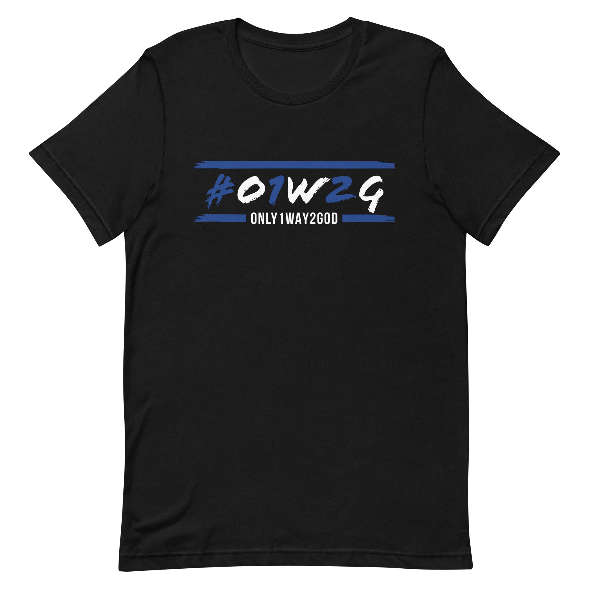 A bold two-sided design with the front displaying “#O1W2G – Only 1 Way 2 God” in striking black and blue typography framed by brushstroke lines, while the back features the scripture reference “John 14:6-7 KJV.” This design combines modern style with timeless truth, making a clear and powerful statement of faith. It inspires believers to confidently share the message of salvation and remind others that Jesus is the only way to God.