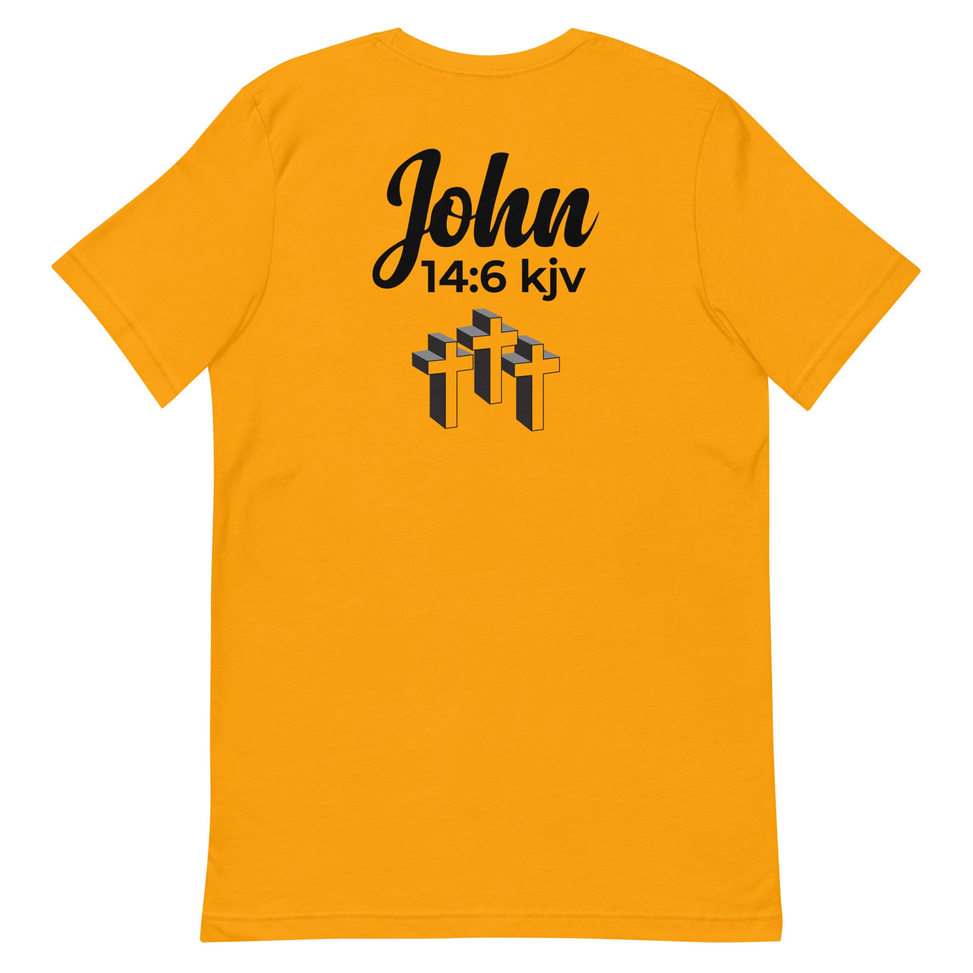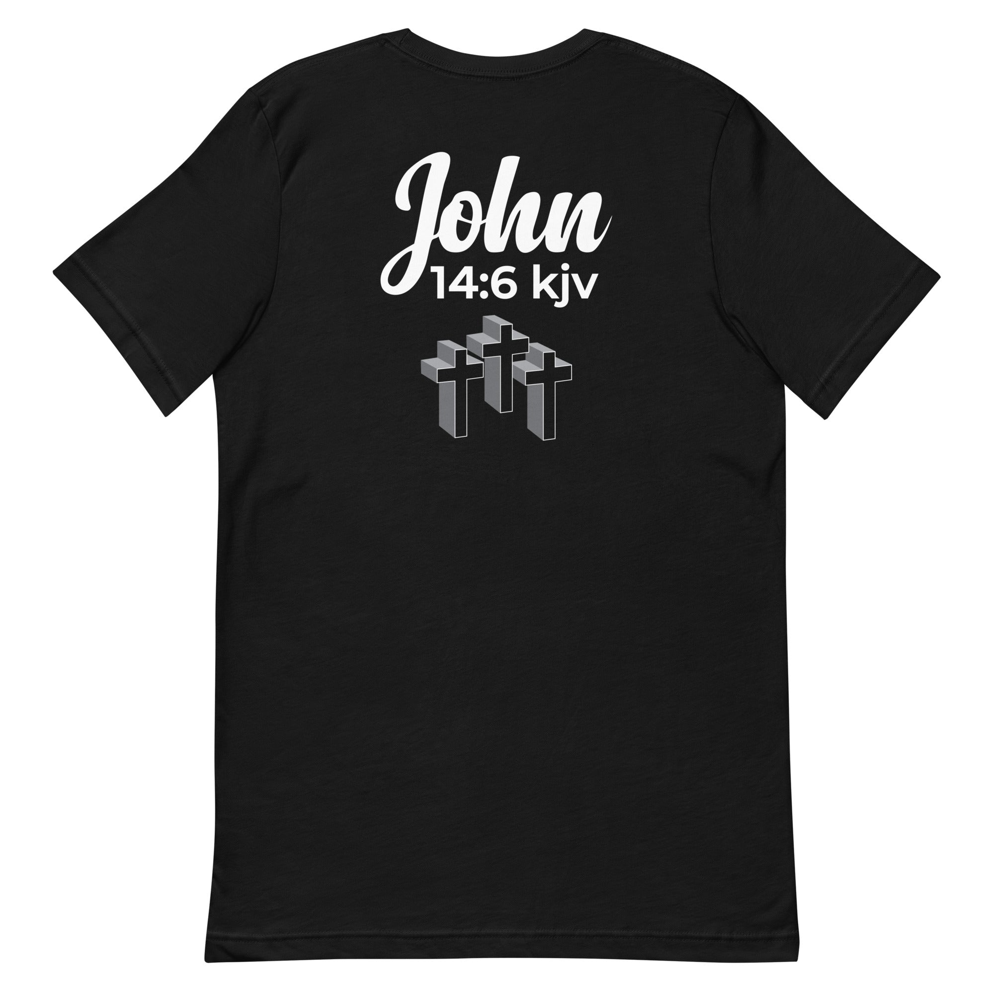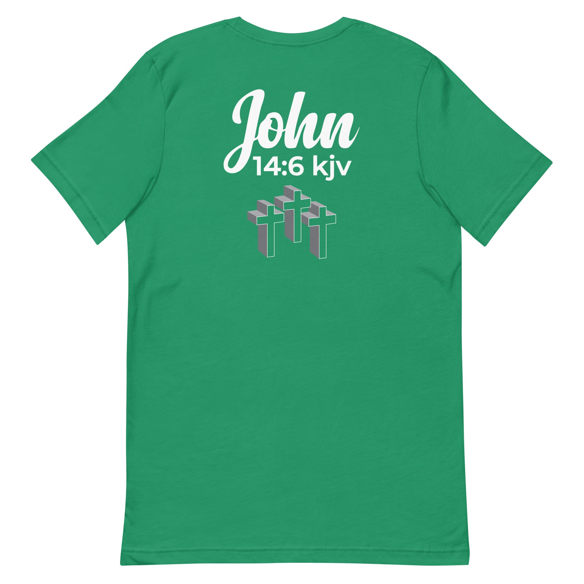 A powerful two-sided design with the front displaying the phrase “Only 1 Way 2 God” accented by a nail and red mark symbolizing the cross, while the back features “John 14:6 KJV” above three crosses. This design reminds believers of the one true way to salvation, making it both inspirational and deeply meaningful.