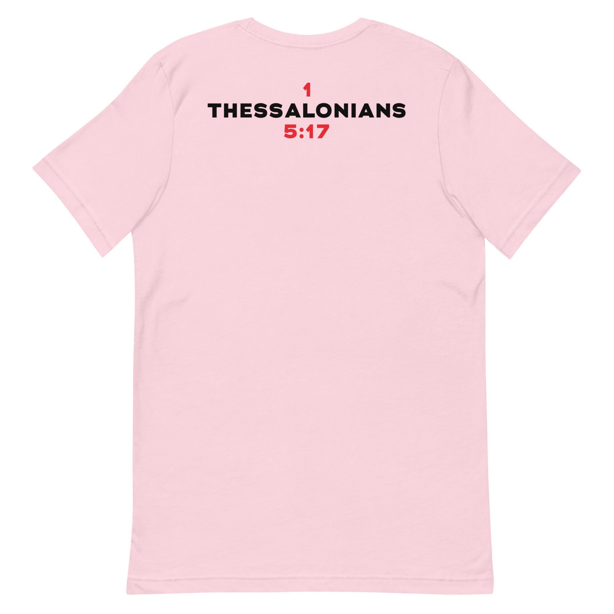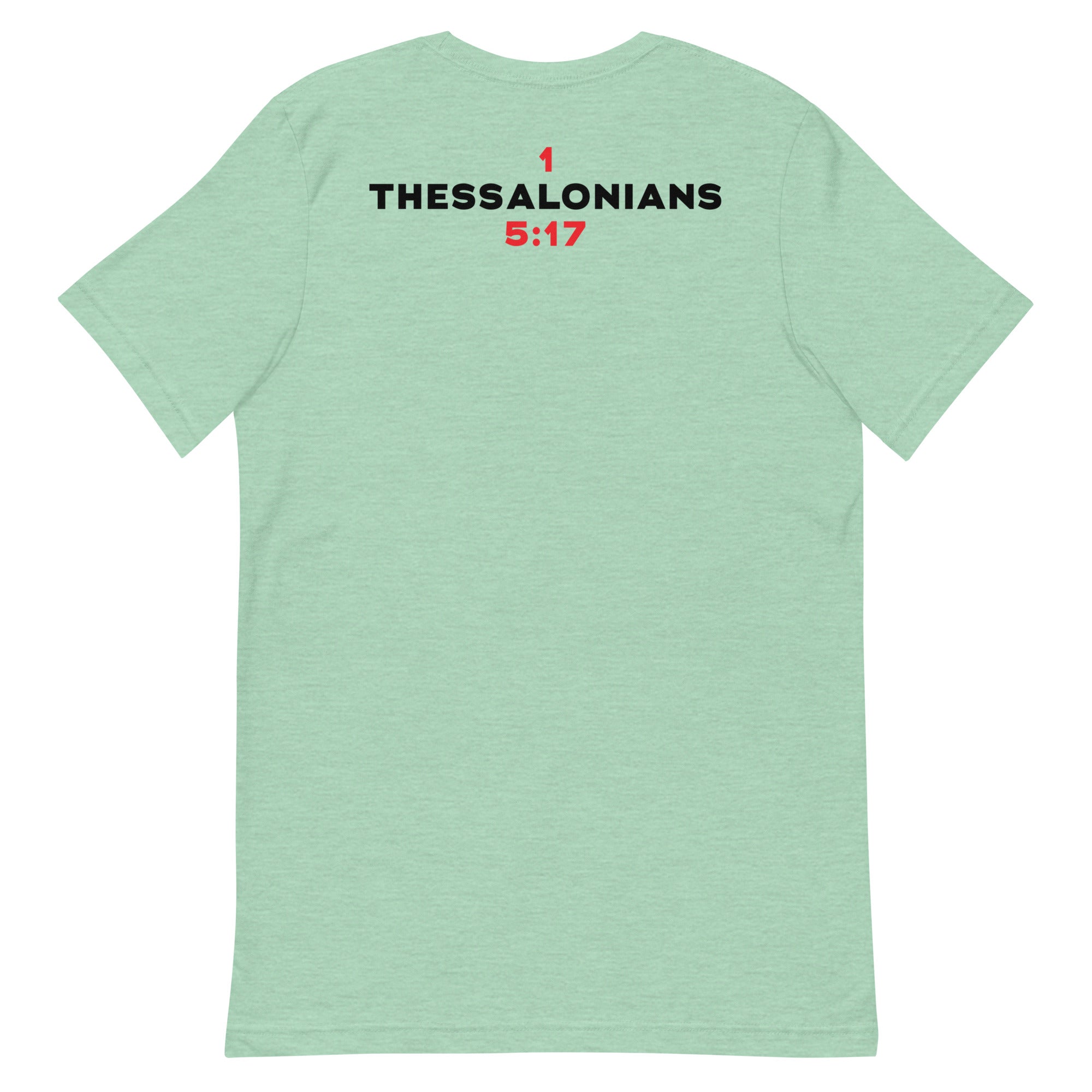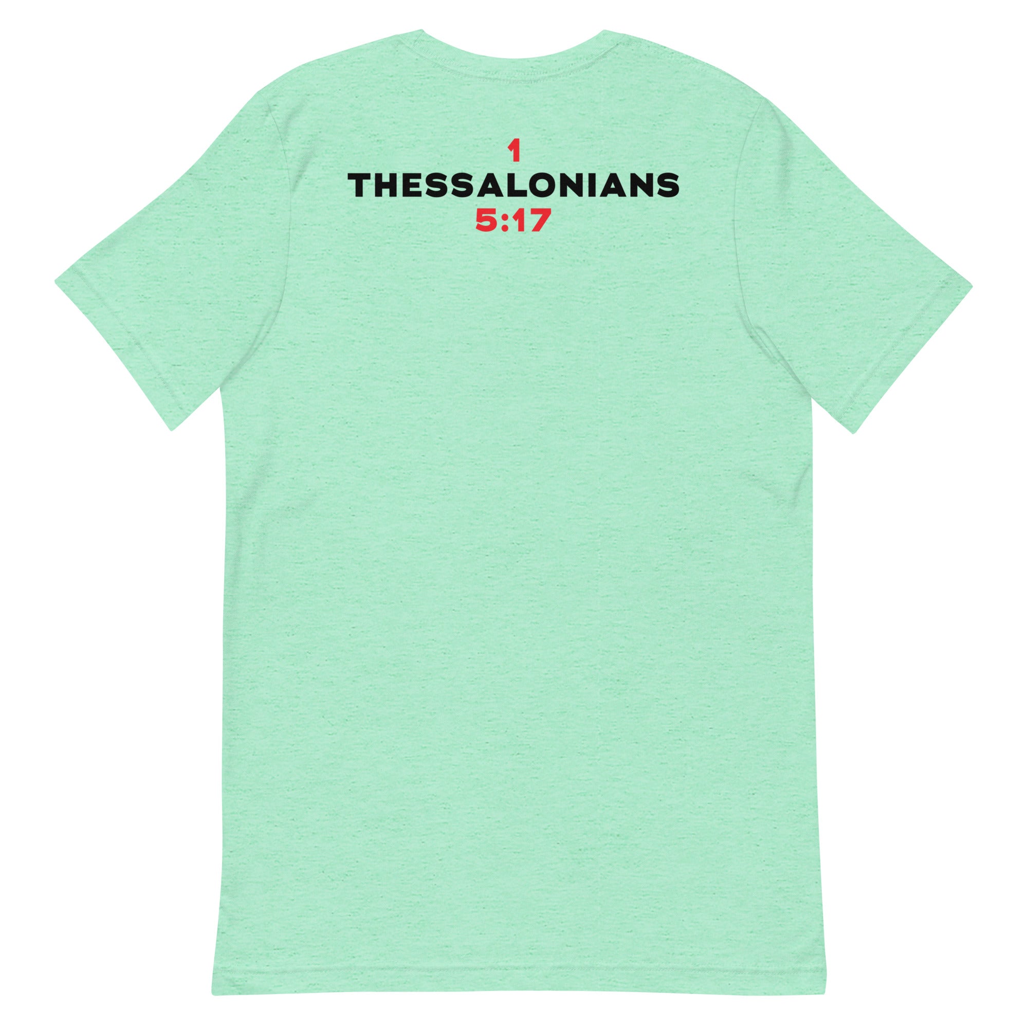 This bold red and black design declares “Prayer Life On Fleek” with an energetic and modern style. The verse reference, 1 Thessalonians 5:17 (“Pray without ceasing”), reinforces the call to live in constant communion with God. The youthful and trendy wording bridges faith and culture, making it a powerful reminder that prayer isn’t outdated—it’s the foundation of a strong walk with Christ. Wearing this design inspires believers to proudly show that prayer is central to their lives and encourages others to see prayer as both vital and vibrant.