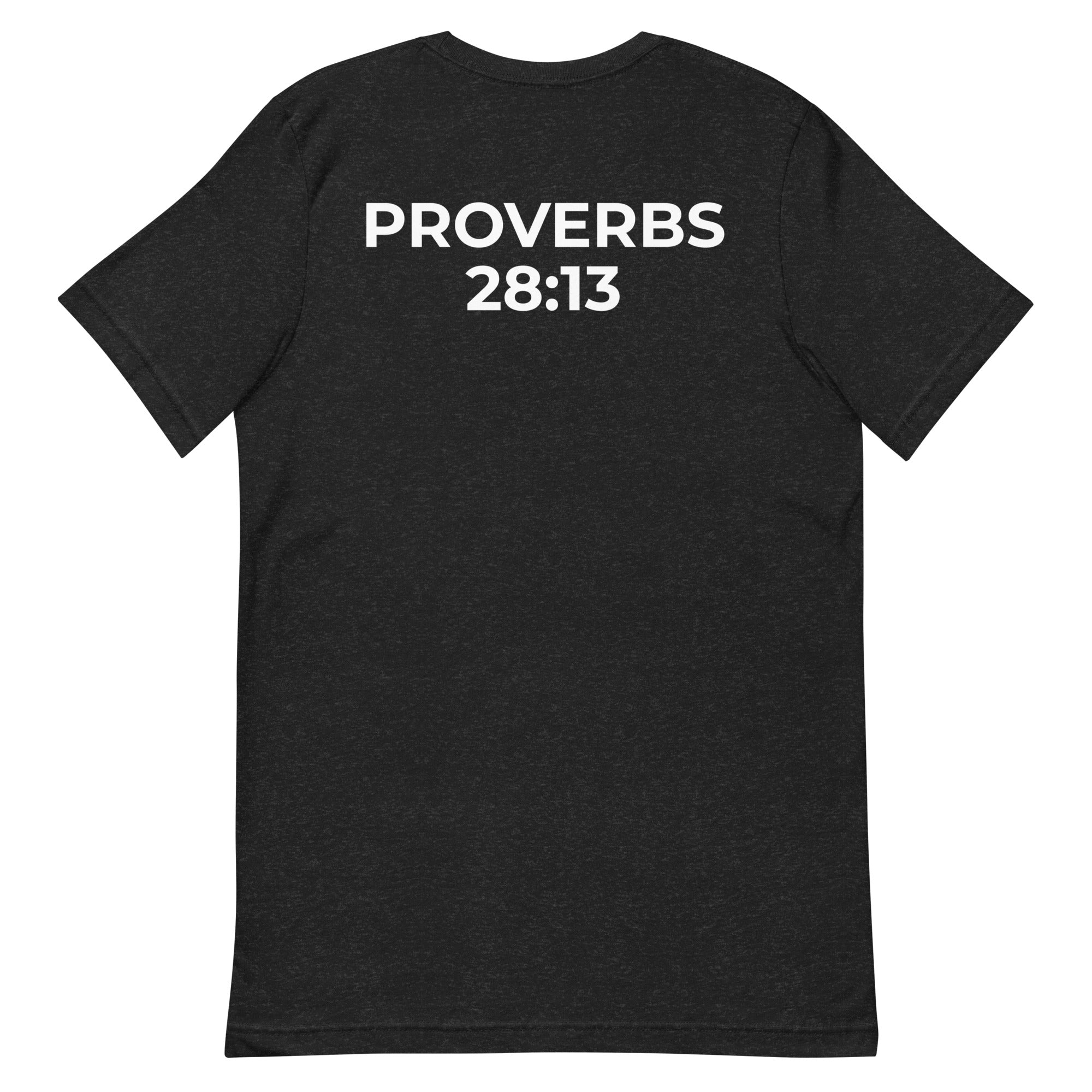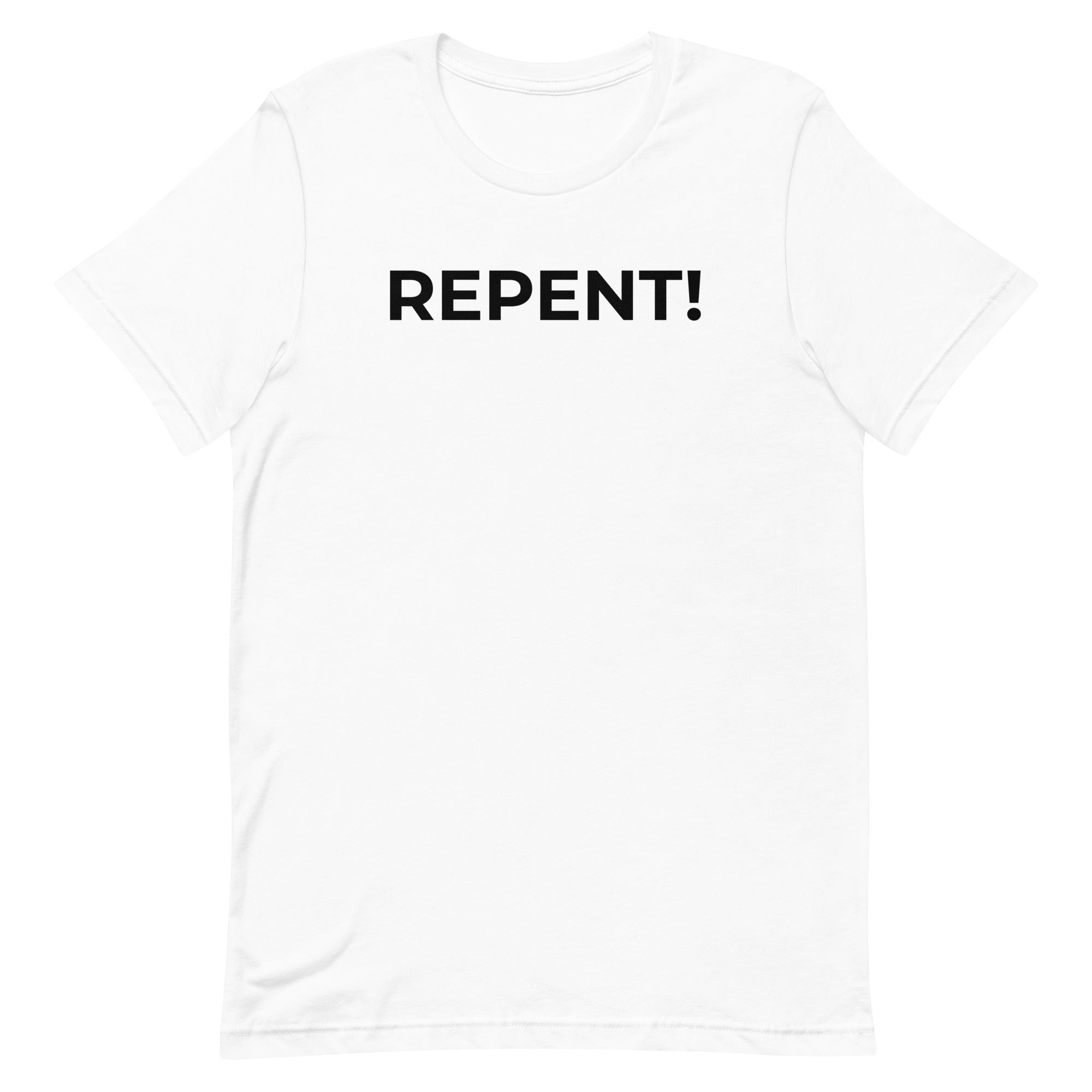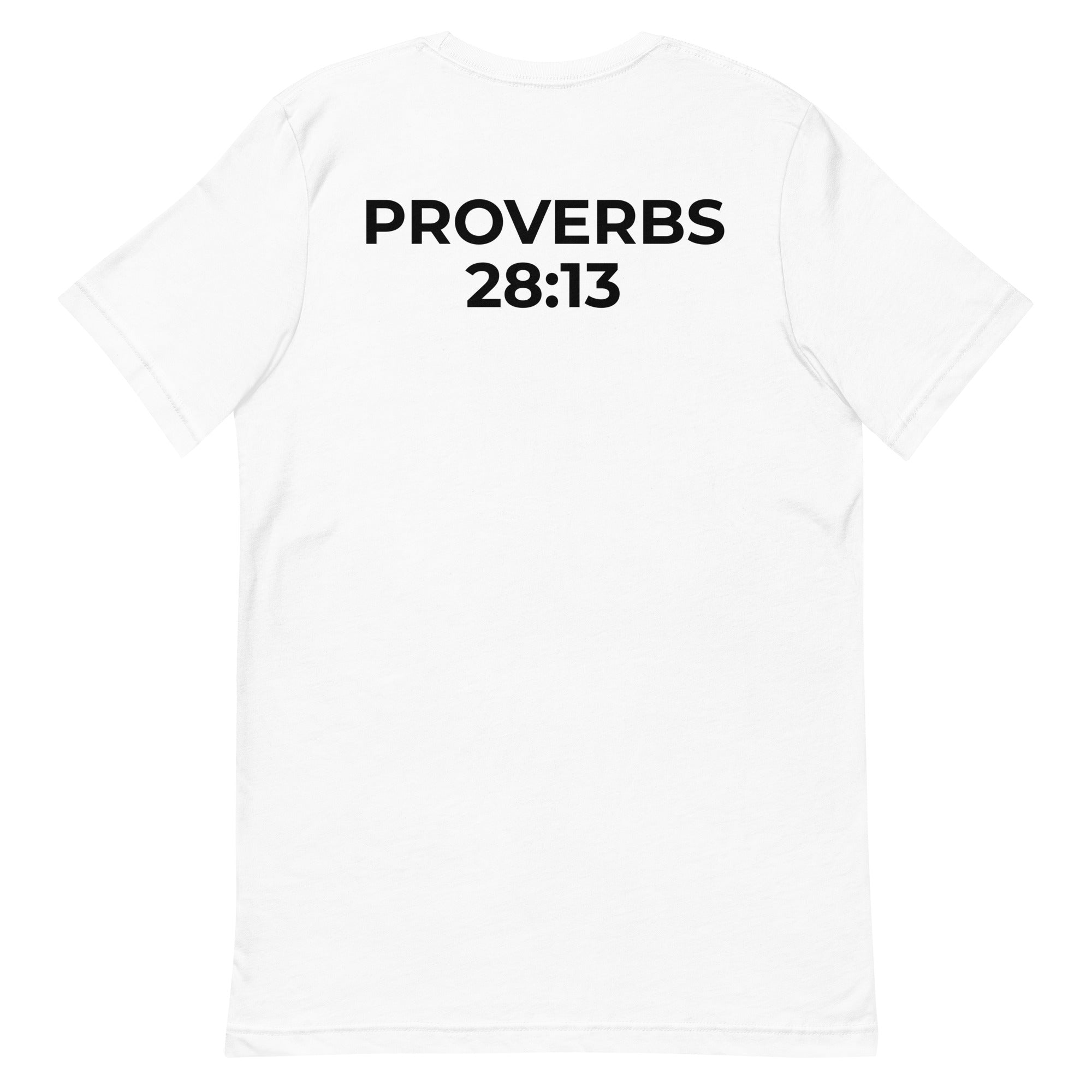 A strong two-sided design featuring the bold command “REPENT!” on the front in clean black typography, and the scripture reference “Proverbs 28:13” on the back. This design delivers a clear and uncompromising biblical message, encouraging believers and others alike to reflect on repentance and the promise of mercy. Its simple yet powerful style makes it impactful and thought-provoking.