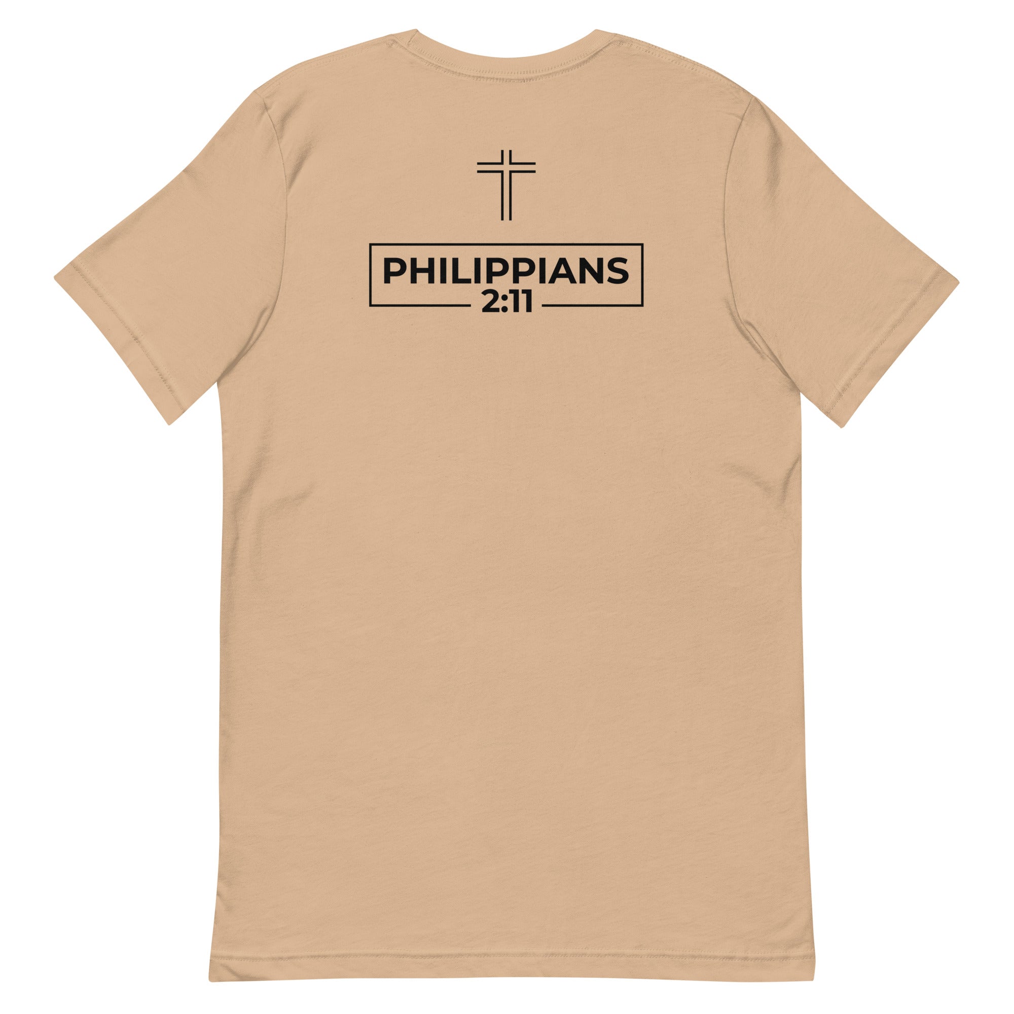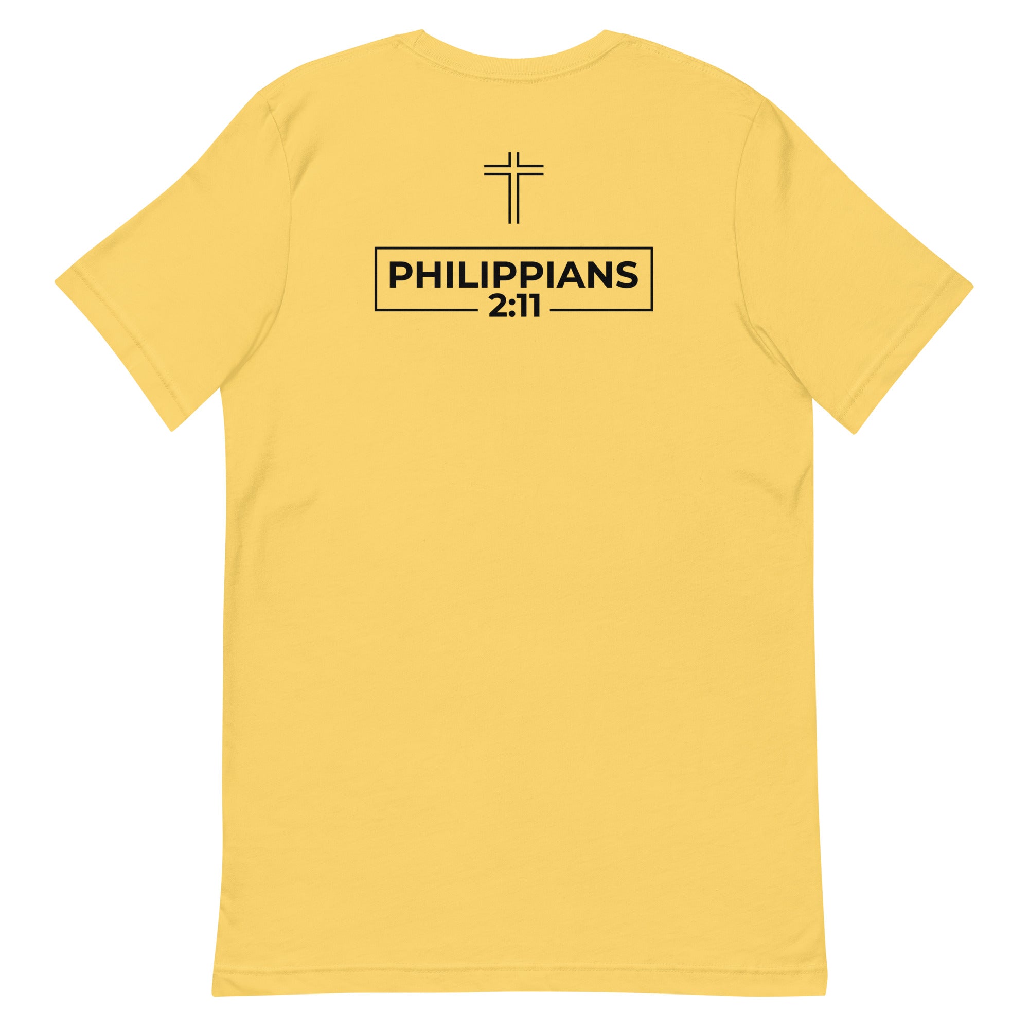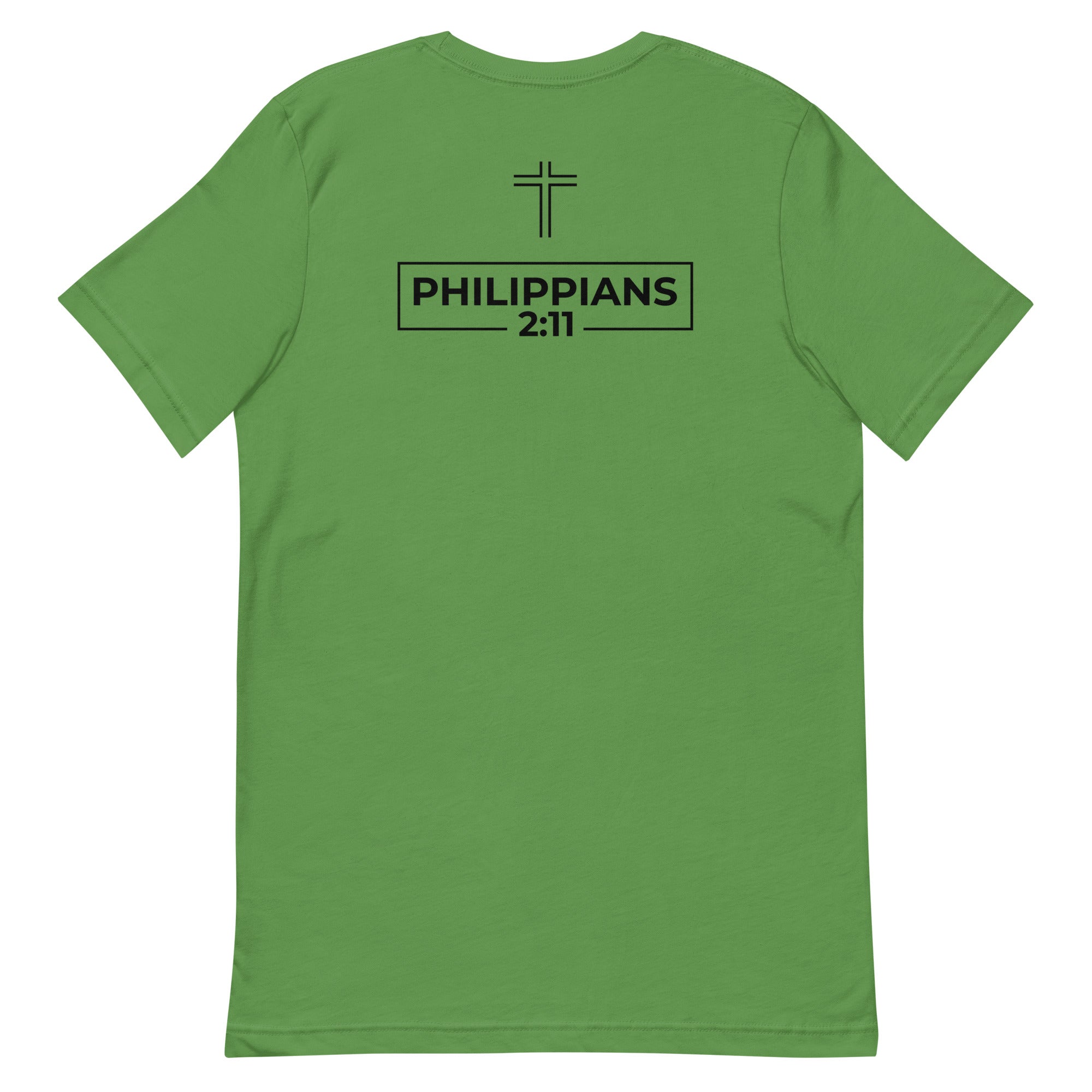 A powerful two-sided design with the front boldly declaring “Jesus is Lord” in striking black typography accented by a red circle, while the back features a cross above the scripture reference “Philippians 2:11.” This design makes a clear and uncompromising statement of faith, reminding believers of the ultimate truth that every tongue will confess Jesus Christ as Lord. Its strong visual impact serves as both a personal declaration and a witness to others.
